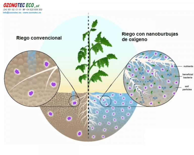 Las nanoburbujas permiten una disolución de oxígeno mucho más eficiente en el agua de riego, mejorando la absorción de nutrientes y la actividad microbiana beneficiosa. Reducen enfermedades y aumentan la productividad.